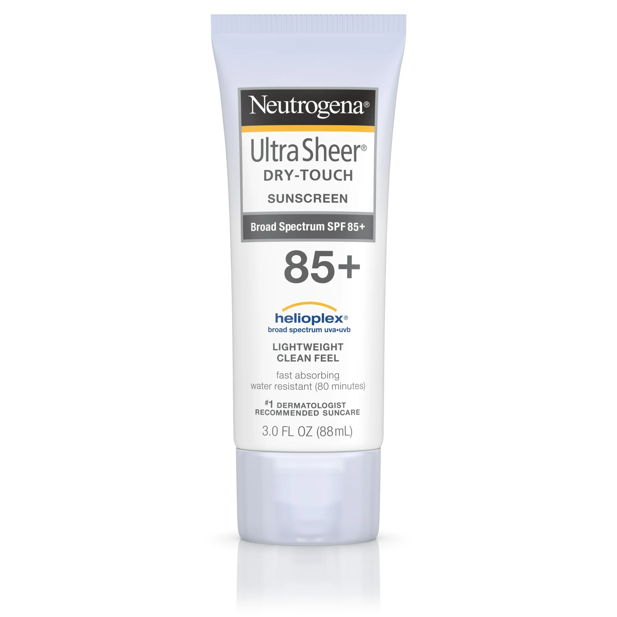 Get powerful sun protection without the heavy finish with Neutrogena Ultra Sheer Dry-Touch Sunscreen. This Broad Spectrum SPF 85 sunscreen lotion with Dry-Touch technology absorbs fast for a clean, ultra-light feel and shine-free finish. This sunscreen is formulated with Helioplex Technology, which offers superior broad spectrum protection from aging UVA rays and burning UVB rays. Fast-absorbing and water-resistant, this non-greasy formula is non-comedogenic and PABA-free.